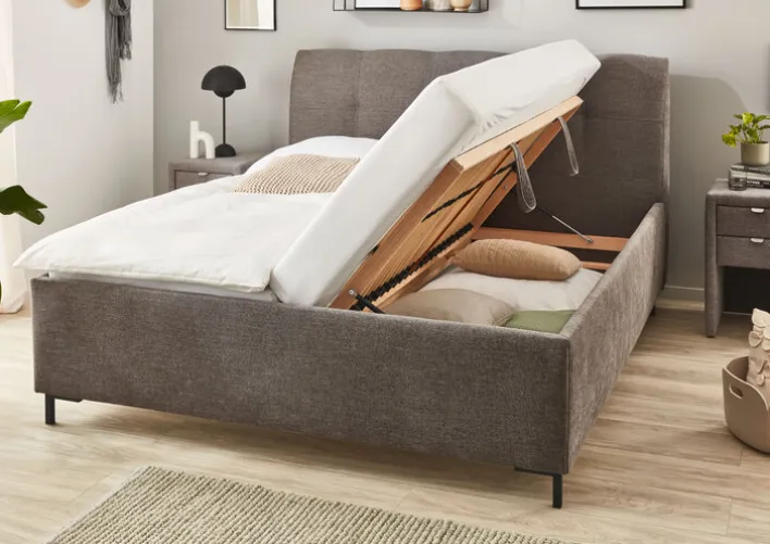 Das Polsterbett SIZELESS verspricht höchsten Schlafkomfort. Die Lattenroste und die Matratzen mit Härtegrad H und H3 sind inklusive. Das Bett verfügt über große Bettkästen, die sich seitlich mit Gasdruck öffnen lassen. Hier ist viel Platz für Decken, Kissen und zusätzliche Bettwaren. Das graue Polsterbett passt zu nahezu jedem Wohnstil. Es hat ein hohes, ebenfalls gepolstertes Kopfteil mit dekorativer Steppung und kann so auch für gemütliche Lesestunden genutzt werden.