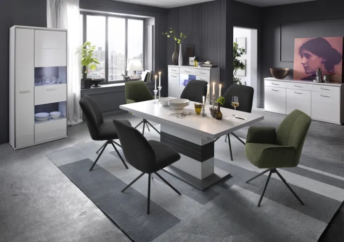 Der komfortable Polsterstuhl TAYLOR im Farbton anthrazit wirkt edel und passt in das modern eingerichtete Wohn- oder Esszimmer. An einem Holz- oder Glastisch platziert, kommt der drehbare Stuhl besonders gut zur Geltung. Er ist vielseitig kombinierbar und fügt sich nahtlos in bereits bestehende Einrichtungen ein. Der Polsterstuhl sorgt dank seiner weichen Polsterung für eine angenehme Sitzposition und ist bis zu 120 Kilogramm belastbar.