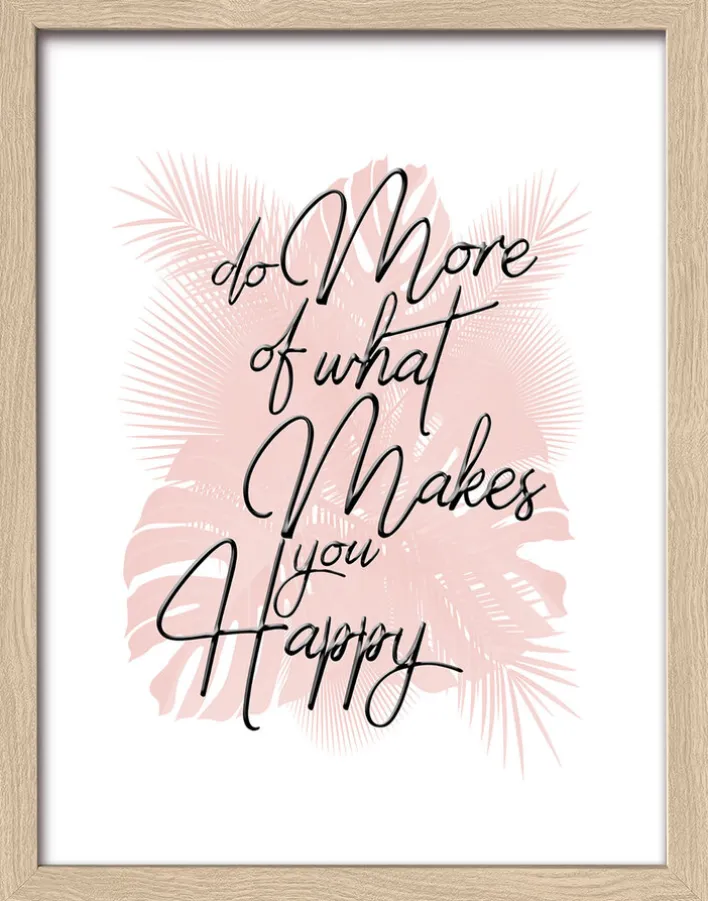 Das Framed-Art Bild MAKES YOU HAPPY von PRO ART vereint Lebensweisheit und Kunst auf die schönste Weise. Mit einem Rahmen in heller Holznachbildung ist das trendige Bild sofort einsatzbereit, um eine Wand im Wohnbereich, Flur, Büro oder Schlafzimmer zu verschönern. Die dezente Farbkombination aus weißfarbigem Hintergrund, rosafarbiger Blätterillustration und dunklem Schriftzug „Do more of what makes you happy“ wirkt herrlich feminin und bietet unzählige Kombinationsmöglichkeiten. Wer ein originelles Geschenk für sich selbst oder einen lieben Menschen in seiner Umgebung sucht, trifft mit dem schicken Bild eine ausgezeichnete Wahl.