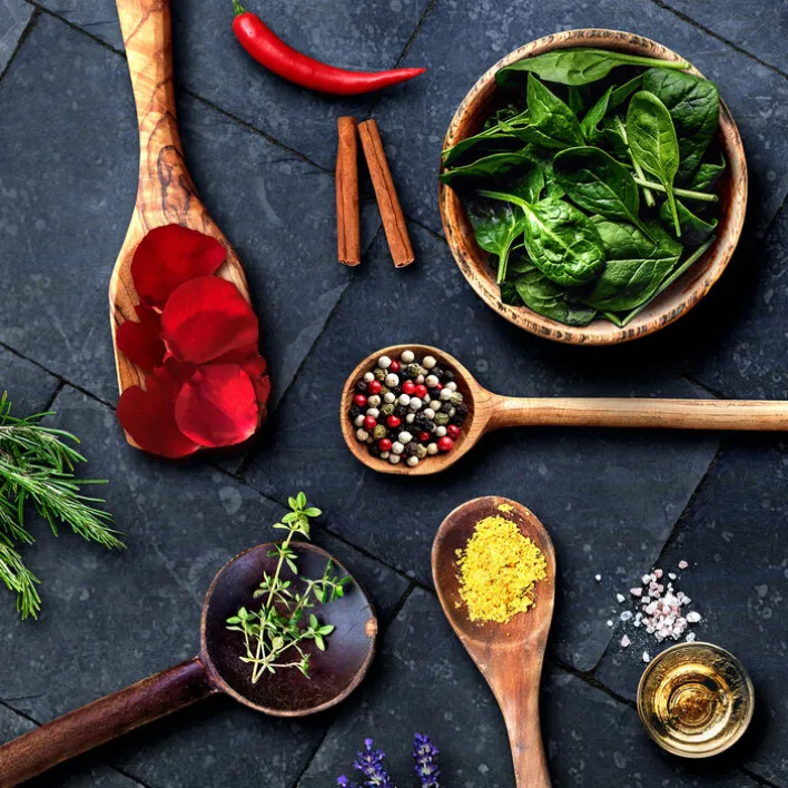 Das PRO ART Glas Art Bild KOCHKREATION I zeigt die quadratischen Maße 20 x 20 cm. Es handelt sich um Floatglas, also Flachglas, das auch mit anderen Ausführungen beziehungsweise ähnlichen Motiven erhältlich ist. Dunkle Fliesen mit Marmorierung und in einem Blauton bilden die Unterlage für eine Holzschüssel, vier Holzlöffel und eine kleine goldfarbige Schale. Das kunstvolle Arrangement dieser Teile ist harmonisch und ansprechend. Die Löffel und die Holzschüssel sind gefüllt mit diversen Gewürzen wie buntem Pfeffer und Basilikumblättern, aber auch mit Rosenblättern. Das edle Salz, das für diese Aufnahme gewählt wurde, liegt wie ein kleiner weißer Steinhaufen neben der goldfarbigen Schüssel. Von der linken Seite ragt noch ein Rosmarinzweig in das Bild hinein, von unten sind es lilafarbene Blüten. Außerdem sind in der oberen Hälfte zwei Zimtstangen und eine rote Chilischote auf den Fliesen zu sehen. Die vielfältige Farbgebung ist ausgesprochen ansprechend, das Bild strahlt trotz der teilweise kräftigen Farben viel Ruhe aus. Das PRO ART Glas Art Bild KOCHKREATION I mit seinen leckeren Gewürzen macht Appetit und sollte in der Küche oder im Esszimmer hängen.