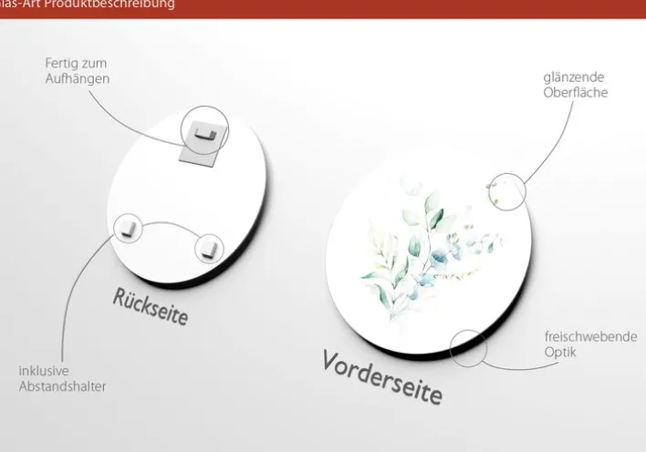 Das Motiv ist digital auf eine Glasplatte gedruckt. Das verwendete Floatglas hat eine glänzende Oberfläche, wodurch die Strahlkraft der Farben höher ist. Zum Schutz vor Kratzern und Beschädigungen ist das Motiv auf die Rückseite der Glasplatte gedruckt. Für die Wandbefestigung ist das runde Bild mit einem Aufhänger und Abstandhaltern ausgestattet.