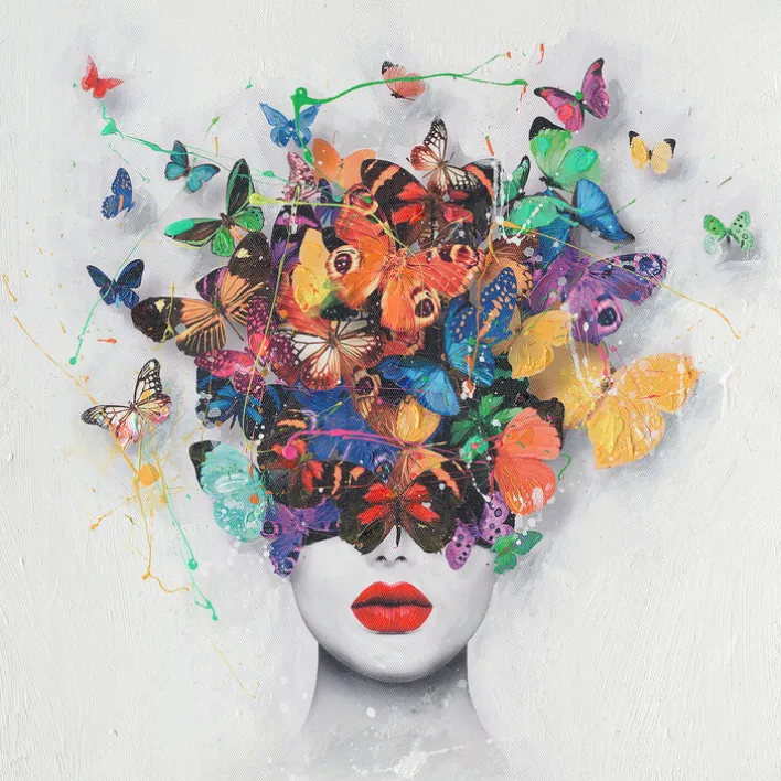 Das PRO ART Handpainting Bild COLOURFUL COLLECTION I begeistert den Betrachter mit einem außergewöhnlichen, sehr farbenfrohen und zugleich geheimnisvollen Motiv. Gleichzeitig ist das Bild eine stilvolle Wanddekoration, mit der Sie Ihrer Einrichtung eine individuelle Note verleihen können. Auf dem PRO ART Handpainting Bild COLOURFUL COLLECTION I ist eine Frau zu sehen, auf deren Kopf zahlreiche bunte Schmetterlinge sitzen. Sie bedecken sowohl Haare als auch Augen und hauchen dem Bild mit ihren bunten Farben Leben ein. Die Frau hingegen ist fast komplett in Schwarz-Weiß gehalten. Nur ihre Lippen erstrahlen in einem leuchtenden Rot. Der Hintergrund zeigt sich hingegen in einem dezenten Weiß-Grau, sodass das Bild eine sehr freundliche und helle Ausstrahlung hat. Es eignet sich also hervorragend als Dekoration für verschiedene Wohnbereiche. Das PRO ART Handpainting Bild COLOURFUL COLLECTION I befindet sich auf einer Leinwand aus Textil, die eine quadratische Form und eine Größe von 40 x 40 cm hat. Dadurch ist das Bild vor allem für mittelgroße bis große Räume eine optimale Wahl.