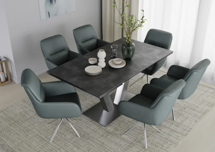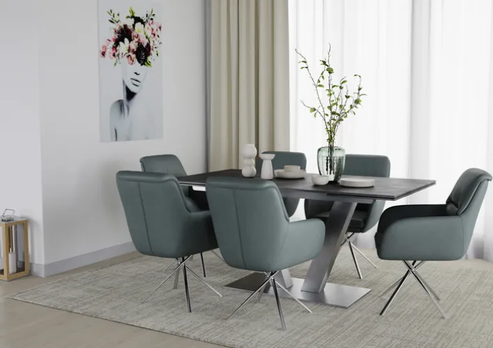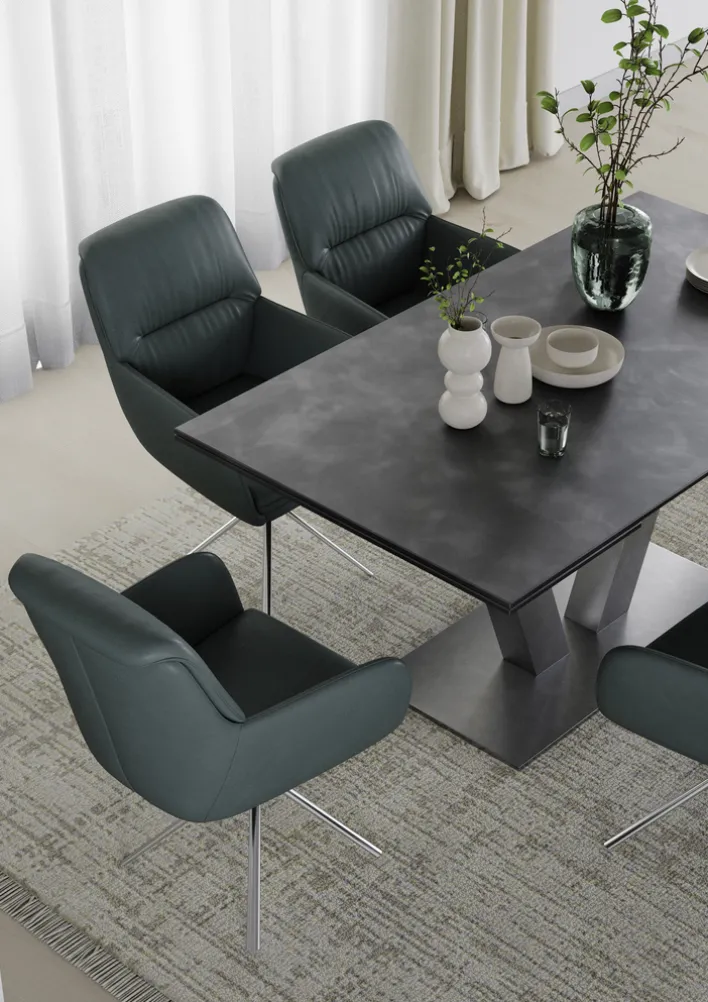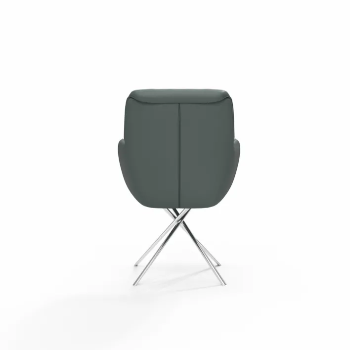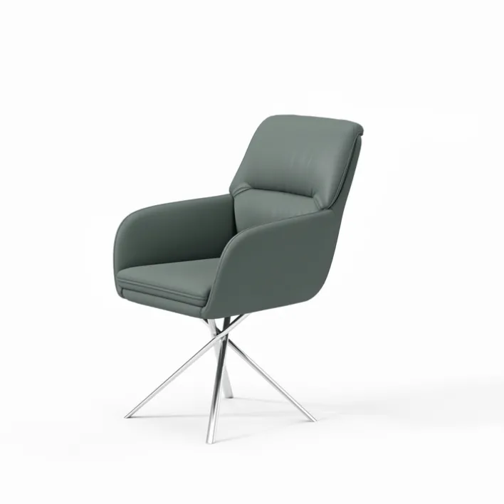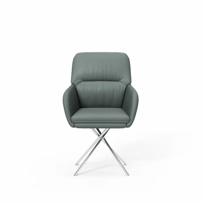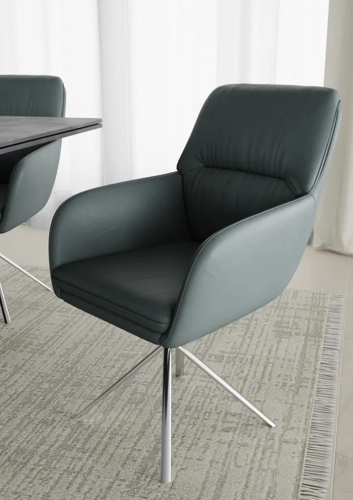 Der Armlehnstuhl BERLIN kombiniert eine moderne Formensprache mit hochwertigen Materialien und elegantem Komfort. Der graublaue Lederbezug verleiht dem Stuhl eine edle, ruhige Ausstrahlung. Das silberfarbige Gestell aus gebürstetem Edelstahl wirkt filigran und stabil zugleich.