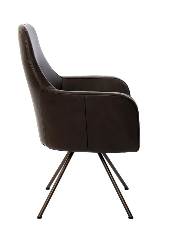 Der Armlehnstuhl aus der Serie RENATA präsentiert sich in einem modernen, industriellen Design. Die Sitzschale ist mit braunem Leder bezogen, das eine glatte, matte Oberfläche mit dezentem Glanz aufweist. Die klare Linienführung und die ergonomisch geformten Armlehnen verleihen dem Stuhl eine schlichte und zugleich charakteristische Optik. Das Vierfußgestell besteht aus pulverbeschichtetem Metall in dunklem Farbton und sorgt für Stabilität sowie einen zeitgemäßen Akzent. Die Sitzfläche und Rückenlehne sind weich gepolstert und bieten guten Sitzkomfort. Der Stuhl ist drehbar und die Armlehnen sind fest integriert. Mit einer maximalen Belastbarkeit von 120 kg, einer Sitzhöhe von 52 cm und einer Sitztiefe von 47 cm eignet sich dieser Stuhl sowohl für das Esszimmer als auch den Wohnbereich. Die Maße betragen 68 cm in der Tiefe, 63 cm in der Breite und 95 cm in der Höhe, bei einem Gewicht von 15 kg. Die Materialkombination aus Leder und Metall sowie das moderne Design machen ihn zu einer passenden Wahl für unterschiedliche Einrichtungsstile.