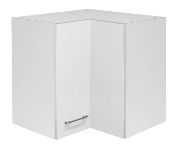 Der weiße Eck-Hängeschrank MEGGIE der Marke QUARTIER ist 60×60 cm breit, 54 cm hoch und 32 cm tief. Sein Design ist schlicht und geradlinig: Er ist abgesehen von einem edelstahlfarbigen Metallgriff komplett in Weiß gehalten und harmoniert dadurch sowohl mit Küchenausstattungen in Weiß als auch in anderen Farbtönen.