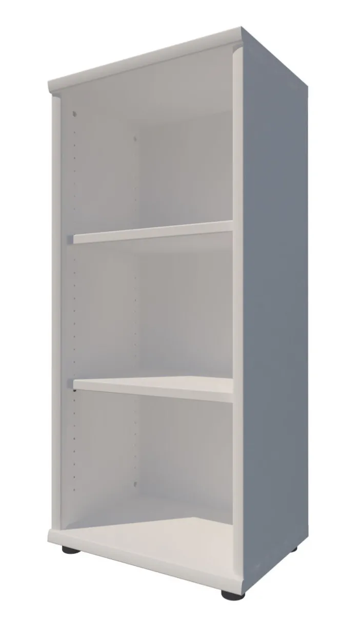 Das Regal verfügt über drei offene Fächer und zwei Einlegeböden, wodurch eine flexible Nutzung zur Ablage und als Stauraum möglich ist. Die Regalböden sind gleichmäßig angeordnet und bieten ausreichend Platz für Akten, Bücher oder Dekorationsgegenstände. Das Möbelstück ist für den Innenbereich konzipiert und eignet sich besonders für den Einsatz im Büro oder Arbeitszimmer. Die Schlichtheit des Designs und die Funktionalität stehen im Vordergrund.