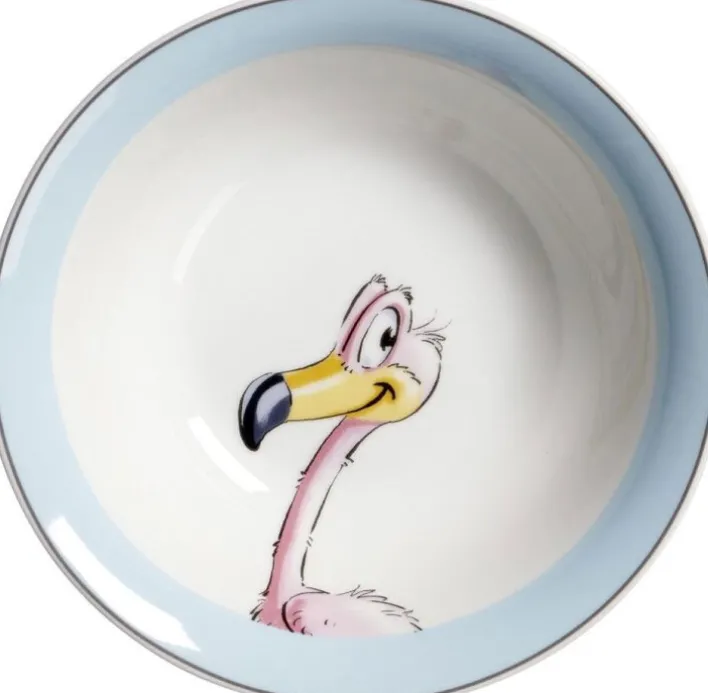 Als Untergrund für den rosafarbenen Flamingo eignet sich das Blau hervorragend. Auf Teller und Tasse ist diese Farbe vollflächig verarbeitet, bei der Schale ist der Untergrund weiß mit einem breiten blauen Rand. Der Flamingo sieht ebenso neugierig aus wie das Kind, das ihn betrachtet. Das Tier schaut knapp am Betrachter vorbei. Es scheint zu lächeln und sorgt so für gute Laune beim Essen.