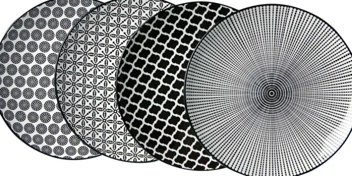 Das Set TAKEO aus dem Hause Ritzenhoff & Breker umfasst vier unterschiedlich gemusterte Teller mit einem Durchmesser von je 26,5 cm. Auf Wunsch lassen sie sich mit weiteren Geschirrteilen der Serie kombinieren. Aber auch einzeln stellen die schwarz-weißen Teller eine geschmackvolle Dekoration dar, ob auf dem Esstisch oder zum Darbieten kleiner Leckerbissen auf Couchtisch und Anrichte.