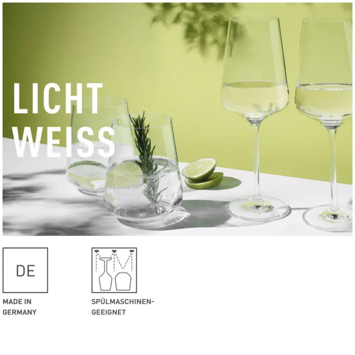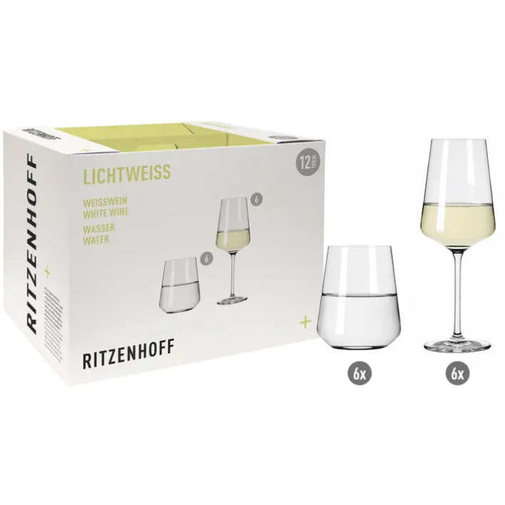 Das RITZENHOFF Wasser- und Weißweingläser-Set LICHTWEISS ist 12-teilig. Es besteht aus reinem Kristallglas. Im Set enthalten sind 6 Trinkgläser à 400 ml Fassungsvermögen und 6 Weißweingläser à 540 ml. Alle Gläser sind spülmaschinengeeignet.