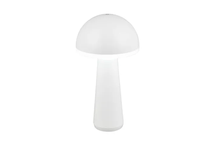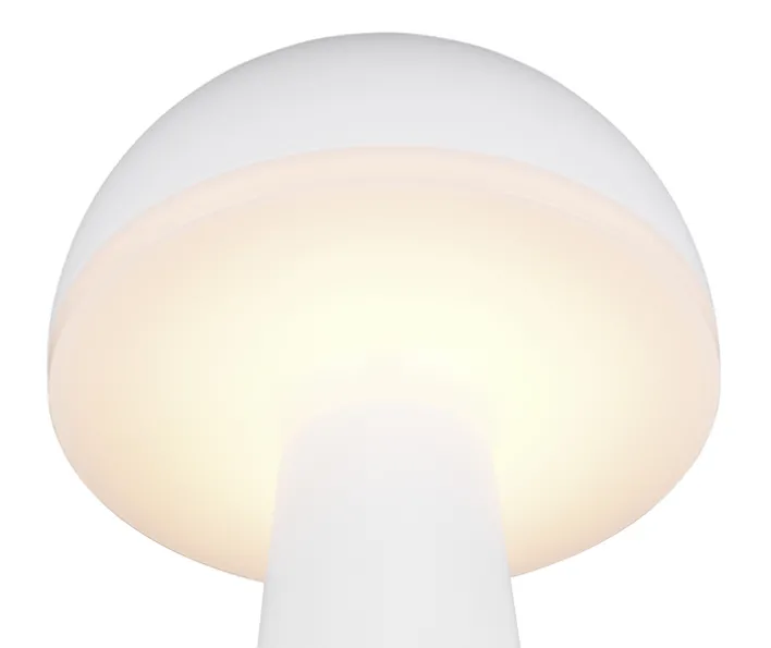 Die weißfarbige Tischlampe FUNGO mit Akku und LED ist aus Aluminium gefertigt. Besonders praktisch an ihr: Sie verfügt über eine separate Ladestation und ist damit noch flexibler einsetzbar.