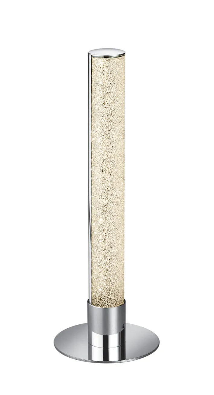 Die RL LED Tischlampe LEIA mit Fernbedienung ist chromfarbig und transparent und hat eine Höhe von 40 cm. Sie eignet sich als Dekolampe und sorgt für eine angenehme Hintergrundbeleuchtung.