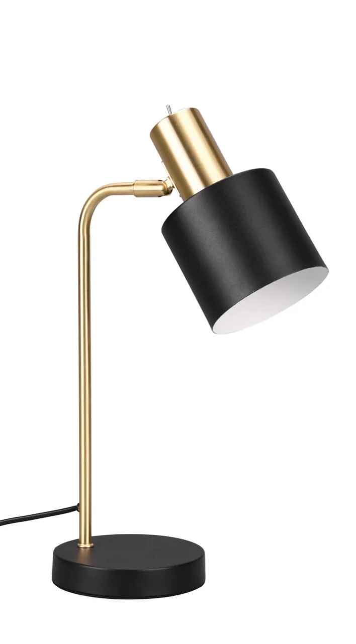 Die 1-flammige Retrofit Tischlampe ADAM von RL überzeugt mit schwarz- und messingfarbigen Details und passt in moderne Einrichtungen. Durch die glänzenden Oberflächen und den zylindrischen Schirm ist die elegante Lampe ein Blickfang auf dem Beistelltisch im Wohnzimmer oder auch auf einer Nachtkonsole im Schlafbereich. Mit dem passenden Leuchtmittel ausgestattet sorgt die schöne Tischlampe stets für eine angenehme Beleuchtung.