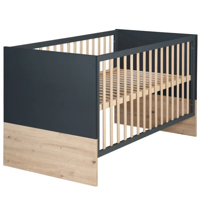 Das Gitterbett aus der Serie LENN bietet eine komfortable Liegefläche von 70 x 140 cm und ist ideal für die Bedürfnisse von Kleinkindern geeignet. Die Hauptfarbe des Bettes ist ein elegantes Anthrazit, das in Kombination mit den natürlichen Eiche-Dekorelementen eine moderne und zugleich warme Ausstrahlung verleiht. Die Holznachbildung in Eiche sorgt für eine robuste und langlebige Konstruktion, die den täglichen Anforderungen standhält.