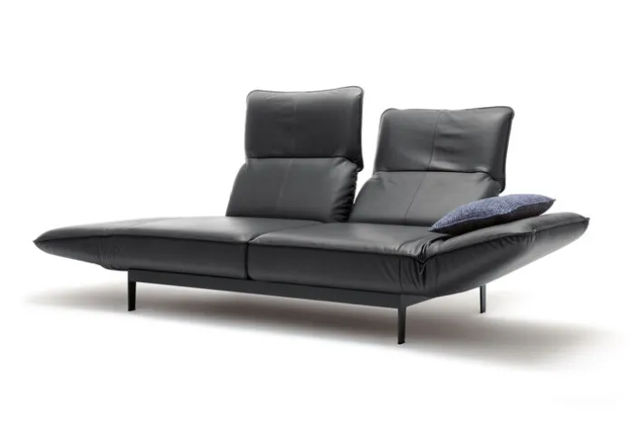 Filigrane Füße aus schwarz lackiertem Stahl verleihen dem Sofa MERA der Marke rolf benz ein schwebend leicht anmutendes Erscheinungsbild. Einzigartigen Sitzkomfort stellen hochwertige Polster auf Stahlwellen-Unterfederung in Aussicht. Jeder Nutzer verfügt über eine hohe und angenehm gepolsterte Armauflage. Verstellbare Rücken regen zum Zurücklehnen an. Der 2-Sitzer MERA von rolf benz ist mit exzellentem Leder in zeitlos attraktivem Schwarz bezogen und dank echt bezogener Rückseite beliebig im Raum aufstellbar. Das Besondere an diesem Sofa ist jedoch die Flexibilität seitens der Gestaltung. Durch das Verstellen der Armlehnen kann im Handumdrehen eine bequeme Liegefläche für die Pause zwischendurch geschaffen werden. Jeder Sitz ist zudem schwenkbar und wird mit wenigen Handgriffen zum erholsamen Longchair. Exzellent verarbeitete Materialien, innovatives Konzept und leicht zu kombinierende Farbgebung machen den 2-Sitzer auch zu einer praktischen Option für das geräumige Homeoffice.