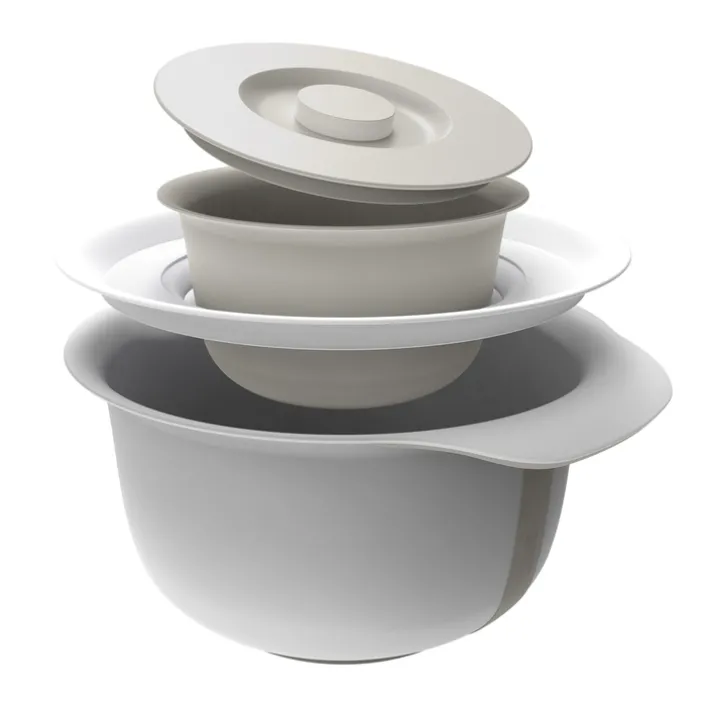 Das Rührschüssel-Set FRESH in Cool grau besteht aus hochwertigem, BPA-freiem Kunststoff (PP). Die Schüsseln mit 4 und 1,2 Liter Volumen, Deckel und Spritzschutz-Ring sind perfekt zum Rühren und Mixen von Teig, dem Mischen von Salaten oder für andere Zubereitungen geeignet.
