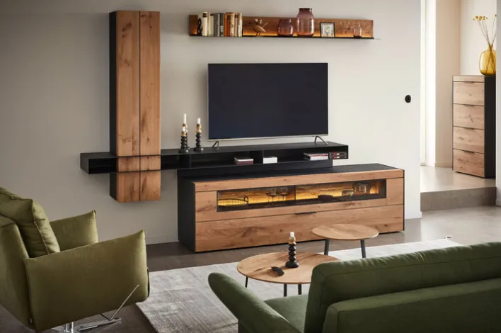Die 4-teilige Wohnwand YORIS aus der SCHÖNER WOHNEN-Kollektion hat ein Stellmaß von etwa 295 x 206 cm und überzeugt mit einer attraktiven Optik. Mit den eleganten Holzfronten in massiver Eiche, schwarzfarbigen Oberflächen und Glas ist die Wohnwand in modern eingerichtete Wohnbereiche integrierbar. Die schöne Wohnwand ist durch das besondere Stellmaß auch für Wohnzimmer mit einem kleineren Raumangebot geeignet. Kombiniert mit einer modernen Wohnlandschaft ist die Wohnwand ideal für gemütliche Fernseh- und DVD-Abende.