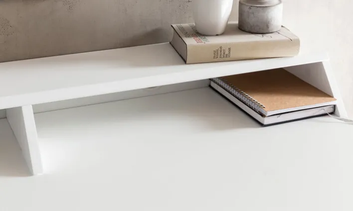 Der elegante Schreibtisch hat einen skandinavischen Look und passt in modern eingerichtete Wohnbereiche. Durch sein Vierfußgestell und die Tischplatte mit den Maßen 110 x 60 cm ist der Schreibtisch ein Blickfang. Der Schreibtisch ist ein schickes Accessoire für das Wohn- oder Esszimmer. Zwei offene Fächer und zwei Schubkästen bieten Stauraum für verschiedene Kleinteile. Auf der Tischplatte ist Platz für ein Notebook. Der Schreibtisch trägt zu einem wohnlichen Ambiente bei.