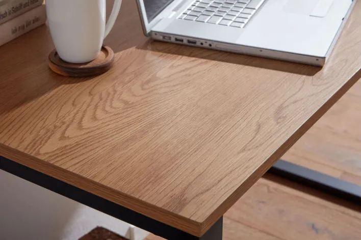 Dieser Schreibtisch besticht mit seinem modernen und puristischen Design. Die hellbraune Tischplatte ist in Holznachbildung aus mitteldichter Faserplatte (MDF) im Holzdekor von folierter Eiche gearbeitet. Das rechteckige U-Gestell besteht aus schwarzem Metall in der Art von Eisen mit einer matten und pulverbeschichteten Oberfläche. Der Tisch misst in der Tiefe 60 cm, in der Breite 120 cm und in der Höhe 76 cm bei 16 kg Gewicht und einer maximalen Belastbarkeit von 40 kg.