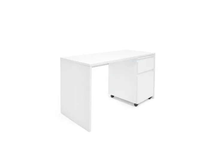 Der 75 cm hohe, weiße Schreibtisch ist 130 cm breit und 54 cm tief. Er beeindruckt mit solider Sachlichkeit und guter Qualität.