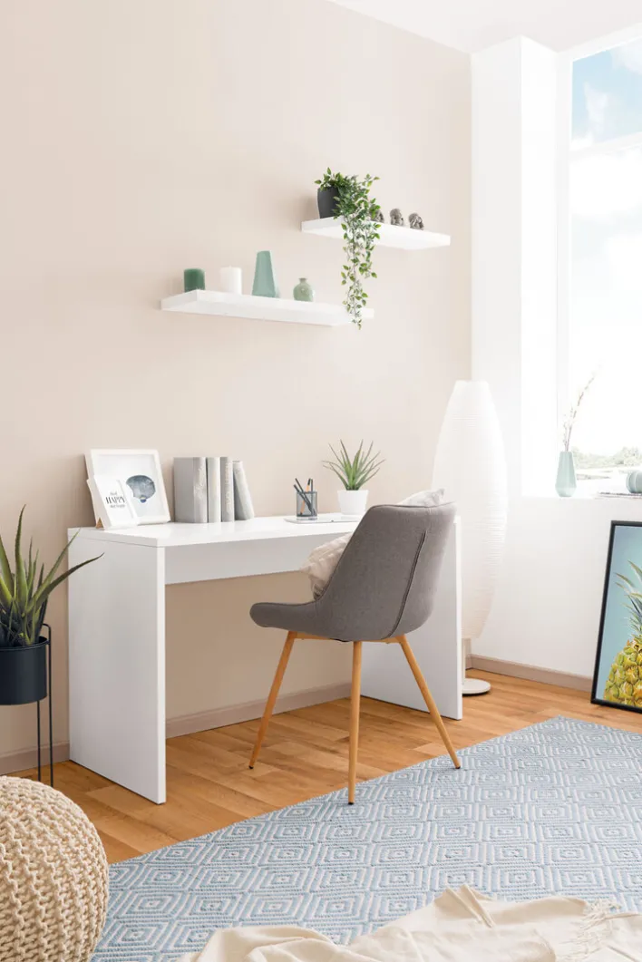 Dieser preisgünstige Schreibtisch von porta.de ist aus der Holznachbildung MDF (Mitteldichte Faserplatte) gefertigt. Die matte, weiße Arbeitsplatte hat als Unterbau ein stabiles Kufengestell. Mit seinen Maßen bietet dieser einfache Schreibtisch viel Beinfreiheit, eine große Arbeitsfläche, Platz für Laptop und Drucker. Darunter lässt sich problemlos ein Rollcontainer stellen, für zusätzlichen Stauraum bei genug Beinfreiheit. Hinten unter der Arbeitsplatte verläuft quer eine Stabilisierung, die zusätzlich für gute Standfestigkeit sorgt. Insgesamt ein sehr praktischer, moderner Schreibtisch, einsetzbar im gesamten Wohnbereich.