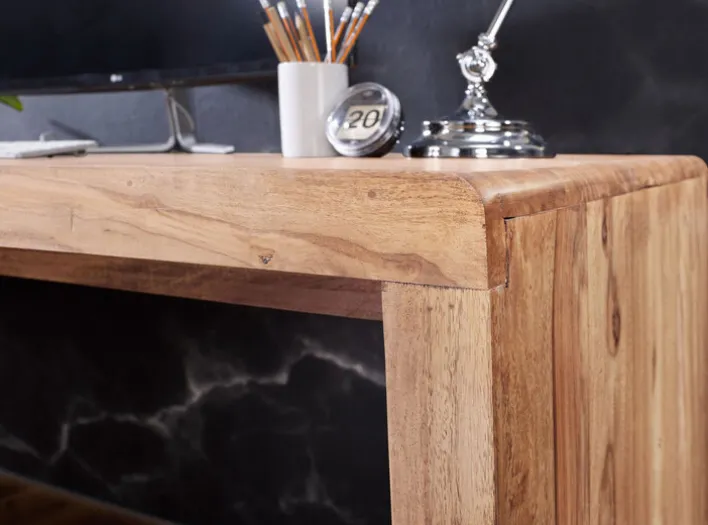 Robust und doch elegant: Der Schreibtisch BOHA überzeugt mit einer gelungenen Kombination aus Funktionalität und Design. Das 140 cm breite und 80 cm tiefe Möbel ist aus massivem Akazienholz gebaut und präsentiert eine ausgesprochen stilvolle Maserung. Das Wangengestell zeigt an den Übergängen von der Platte zu den Seitenteilen angenehm abgerundete Kanten.