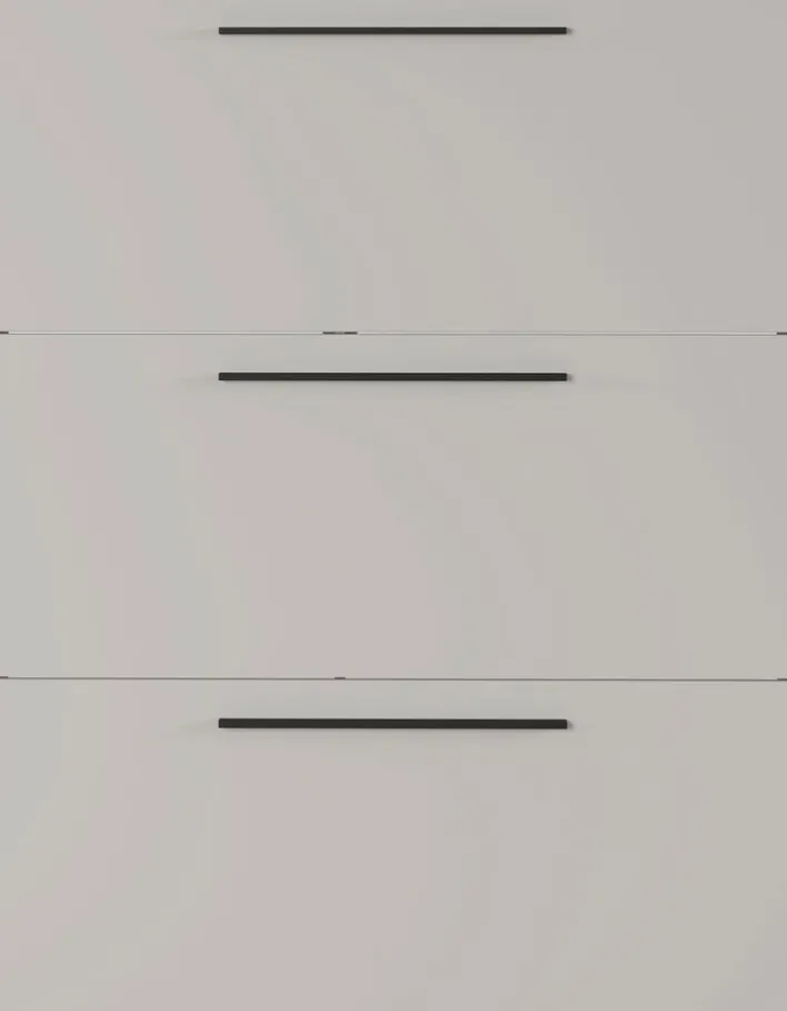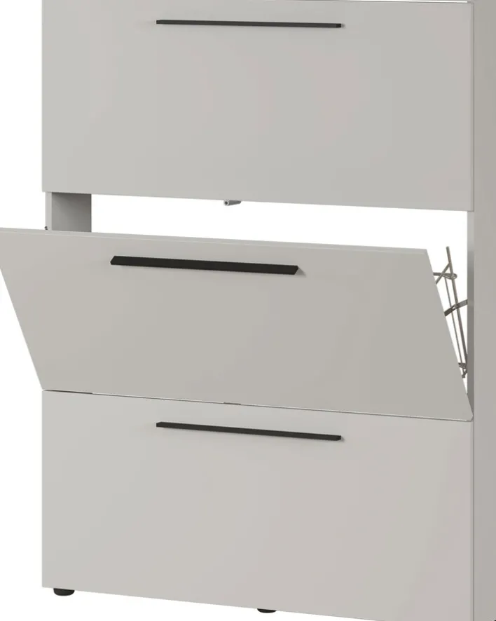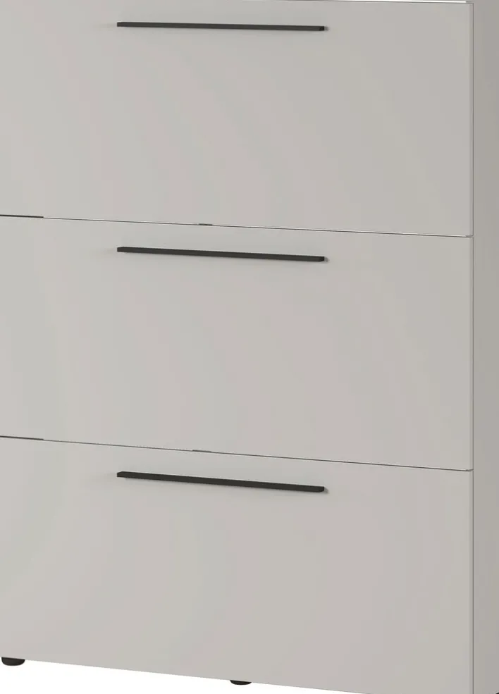 Im Schuhkipper UTAH 100 x 129 cm beige verschwinden Schuhe ordentlich im blickdichten Stauraum auf drei Kippetagen. Hinter den Klappen mit schwarzen Griffleisten sind mehrere Stabablagen verborgen.