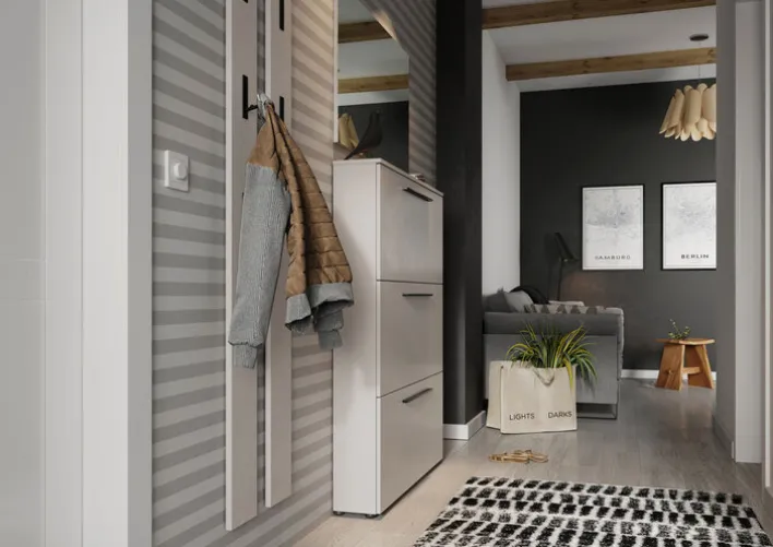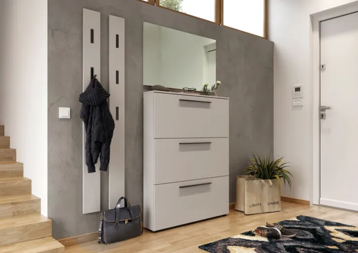 Der Schuhkipper UTAH spart Platz und gewährleistet das Trocknen von nassen Straßenschuhen ohne Platzbedarf in schmalen Fluren. Dafür sind hinter jede der drei Schuhklappen Drahtgestelle für die Schuhaufnahme montiert. Dadurch wird Feuchtigkeit von Stiefeln, flachen oder Absatzschuhen sofort weggeleitet. Gleichzeitig verhindert das dezent designte Möbelstück Chaos in Flur und Diele, selbst unter beengten Raumverhältnissen. Maximale Stabilität geben dem Kastenmöbel schwarze, pulverbeschichtete Kugelfüße aus Kunststoff. Damit die MDF-Front in Kaschmiroptik stabil bleibt, sollten die Klappen täglich zur Feuchtableitung kurzzeitig geöffnet werden.