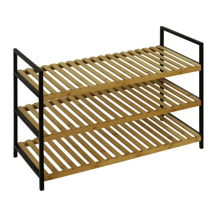 Das Schuhregal FRITZI vereint modernes Design mit praktischer Funktionalität. Es besteht aus massivem Bambusholz in einem natürlichen Farbton, der Wärme und Eleganz in jeden Raum bringt. Die Kombination mit robustem schwarzem Stahl verleiht dem Regal eine zeitgemäße Ästhetik, die sich nahtlos in verschiedene Einrichtungsstile einfügt.