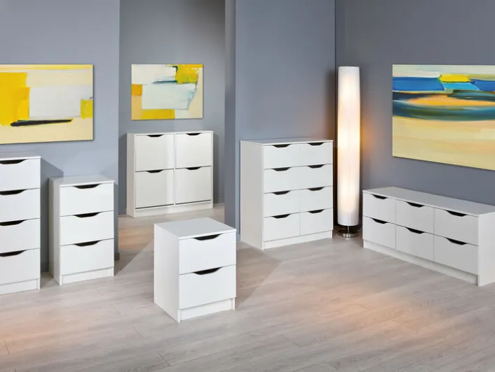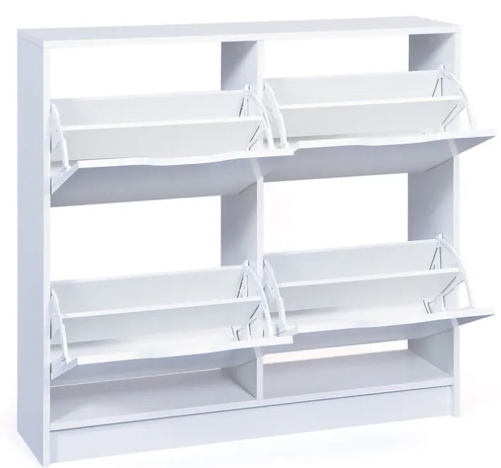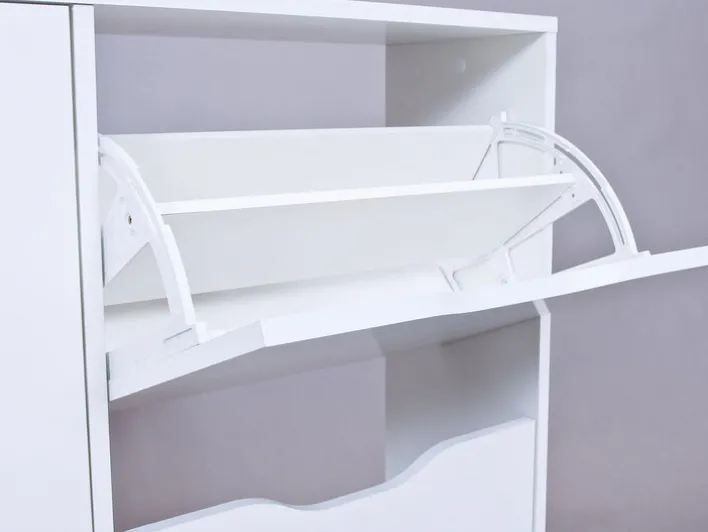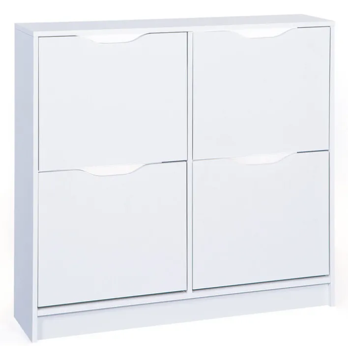 Mit dem Schuhschrank NOAH 8-B herrscht ab sofort immer Ordnung in Diele oder Eingangsbereich. Das schicke weiße Möbelstück benötigt nur wenig Stellfläche und passt somit auch in kleine Wohnungen. Hinter den vier einzeln zu öffnenden Klappen befinden sich insgesamt acht Fächer zur Unterbringung von Halbschuhen, Sneakern, Ballerinas oder Sandaletten.