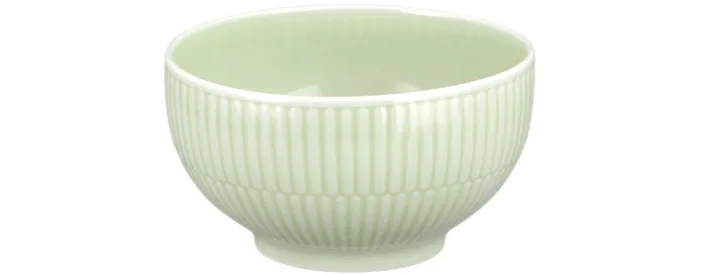 Diese Schale aus der Serie AMINA zeichnet sich durch ihre grüne Farbgebung und ein feines, vertikal geriffeltes Reliefmuster an der Außenseite aus. Das matte, pastellgrüne Porzellan ist glasiert und verleiht dem Objekt eine glatte und pflegeleichte Oberfläche. Die Schale ist rund geformt und besitzt einen leicht ausgestellten Rand sowie einen kleinen Standfuß, der für Stabilität sorgt.