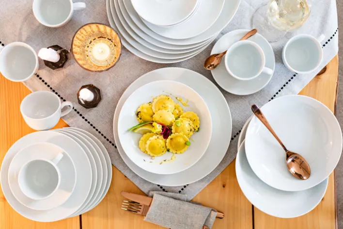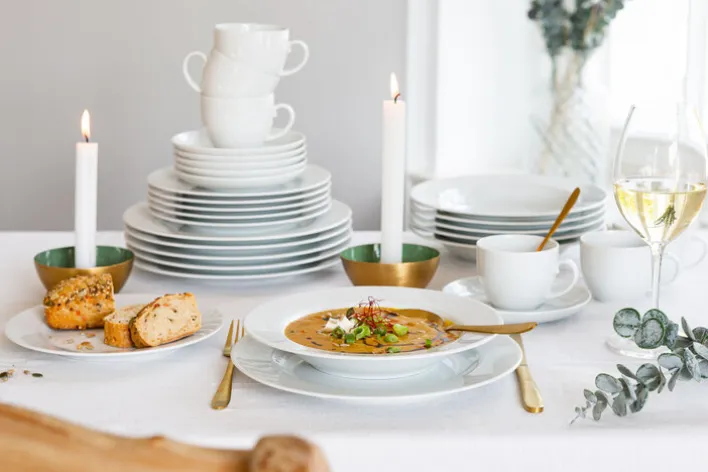 Das Kombiservice RONDO LIANE von Seltmann Weiden ist 30-teilig und bietet ein passendes Geschirr für sechs Personen. Es besteht aus hochwertigem, weißem Porzellan und bereichert jede festliche Tafel.