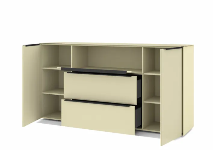 Die Kommode aus der Serie RENO besticht durch ihr modernes Design und die elegante Farbgebung in Kaschmir matt. Mit einer Breite von 182 cm, einer Höhe von 94 cm und einer Tiefe von 42 cm bietet sie großzügigen Stauraum. Die Oberfläche ist lackiert und präsentiert sich in einem ansprechenden Hochglanz-Finish, das dem Möbelstück eine edle Optik verleiht. Die Kommode verfügt über zwei Drehtüren, zwei Schubkästen und eine Klappe, die durch gedämpfte Scharniere sanft schließen. Vier Einlegeböden bieten zusätzlichen Platz für Ihre Utensilien.