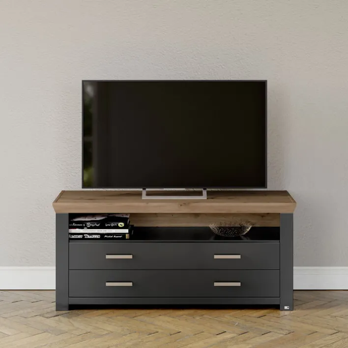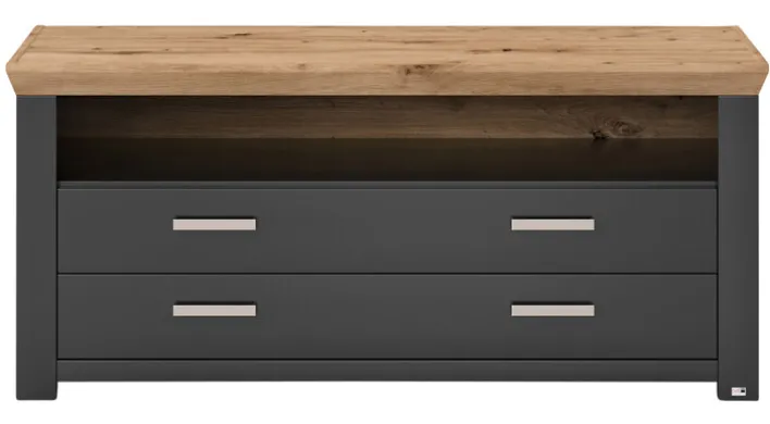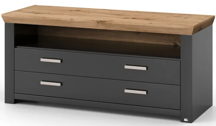 Mit dem set one by Musterring Lowboard YORK 32 in Anthrazit und Oberplatte in Eiche Artisan kommt ein moderner Blickfang ins Wohnzimmer, der viel Platz für Fernseher und Zubehör bietet.