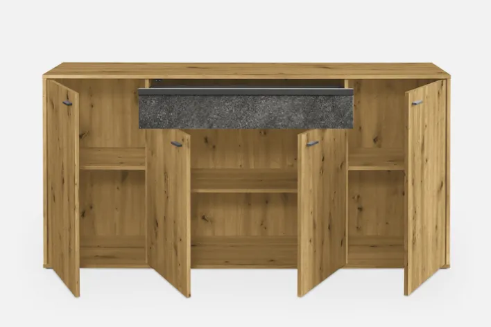 Das 184 x 89 cm große Sideboard DELTON von set one by Musterring nutzt einen Eiche Artisan Dekor Korpus und verschafft diesem durch das mittige Sandstein-Element eine moderne und kontrastreiche Note. Ein Beleuchtungselement ist in dem Sideboard schon inklusive und sorgt speziell in den Abendstunden für eine heimelige Atmosphäre und Raumwirkung.