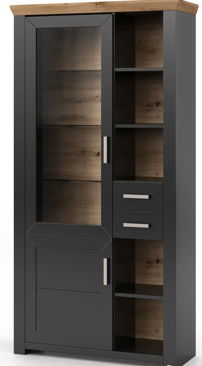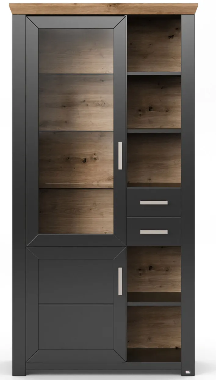 Die Vitrine YORK 05 ist aus robuster Holznachbildung gefertigt. In ihr lassen sich Gläser, Geschirr und Dekoartikel perfekt in Szene setzen. Die Vitrine ist mit zwei Drehtüren, zwei Schubkästen und fünf offenen Fächern ausgestattet. Die attraktive Facettierung und Farbkombination in Anthrazit und Eiche Artisan lockert die Optik harmonisch auf. Auch die sichtbare Hinterwand ist in Holzoptik gestaltet. Matt-silberfarbige Bügelgriffe runden das Design ansprechend ab.
