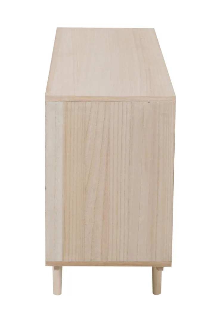 Das Sideboard vereint furnierte Holznachbildung mit Paulownia Massivholz und Einsätzen aus Rattan-Geflecht. Mit seiner natürlichen Optik und der warmen Farbe wirkt das Möbelstück luftig und leicht. Überzeugen kann es jedoch nicht nur mit einem interessanten Design! Hinter zwei Drehtüren bietet es viel Stauraum für Alltagsgegenstände. Die offenen Fächer sind die perfekte Wahl zur Aufbewahrung von Büchern oder Dekoartikeln, die den Wohnraum verschönern.