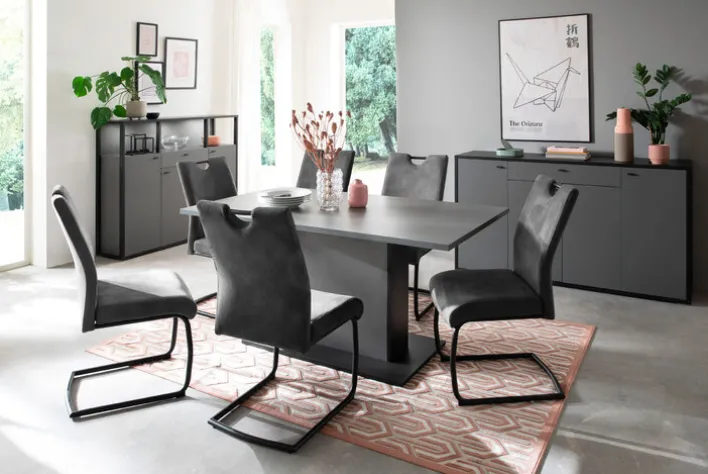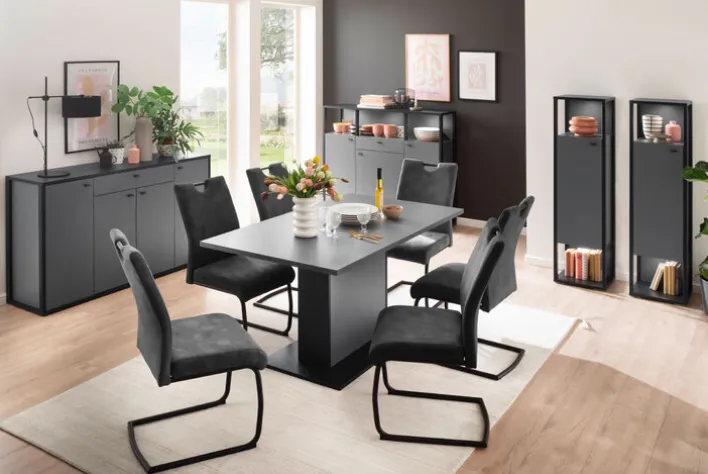 Das Sideboard LUXOR 165 x 92 cm Royal grau/ anthrazit ist der ideale Stauraum mit einem Schubkasten und Seitenablagen hinter vier Drehtüren mit zwei Einlegeböden mit einer Tiefe von 44 cm.