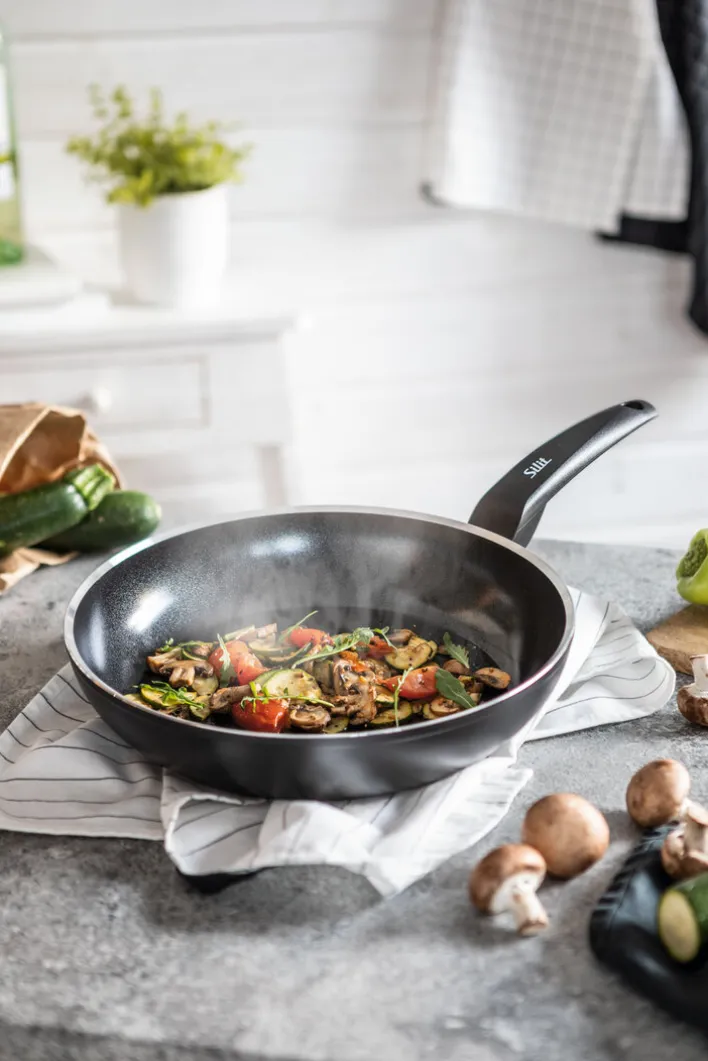 Die runde Pfanne ist mit der Antihaftversiegelung CeraProtect ausgestattet, zudem ist das Aluminium hitzebeständig. Sie ist für alle Herdarten geeignet, auch für Induktionsherde. Auffällig ist ihr ergonomisch geformter Griff. Er liegt sehr gut in der Hand und bildet so einen optimalen Hebel, um die Pfanne zu bewegen. Da die Stielpfanne MESSINO 6 cm hoch ist, haben Sie reichlich Platz für Gemüse, Fleisch sowie Nudeln oder Reis, die hier mitgebraten werden sollen. Durch die Beschichtung gelingen auch Eierspeisen und Pfannkuchen.