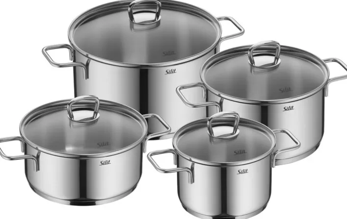 Dieses Set besteht aus einem Bratentopf mit circa zwanzig Zentimeter Durchmesser und drei Fleischtöpfen mit sechzehn, zwanzig und vierundzwanzig Zentimetern Durchmesser sowie vier passende Sichtkochdeckel.