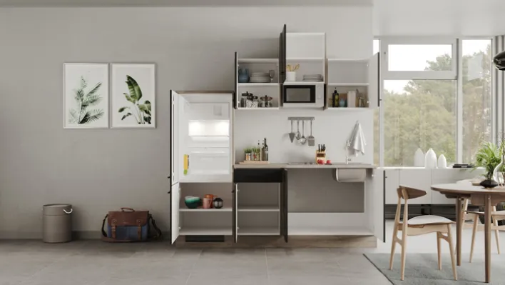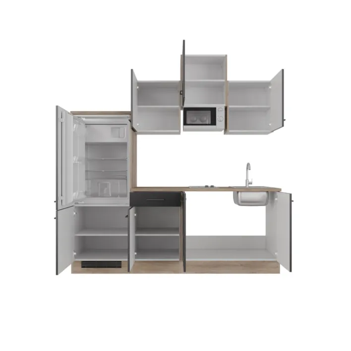 Die kompakte MARY Touch Singleküche hüllt sich auf rund 210 x 205 x 60 cm nahezu komplett in Schwarz, lediglich der untere Teil aus Endgrain Oak Dekor setzt einen gekonnten hellen Kontrast. Ideal für kleinere Wohnungen und Single-Haushalte, bietet die Küche genügend Freiraum für eine bis zwei Personen. Küchengeräte sind bei der Singleküche MARY Touch schon enthalten. Die Küchenzeile bringt sowohl eine Mikrowelle als auch einen Kühlschrank, eine Glaskeramik-Doppelkochplatte und Spüle mit. Damit können sich auch Hobbyköche voll und ganz ausleben. Die Metallbügelgriffe verleihen der Singleküche indes einen eleganten Akzent, auch die individuelle Anordnung der Hängeschränke unterstreicht die stilvolle Formsprache.