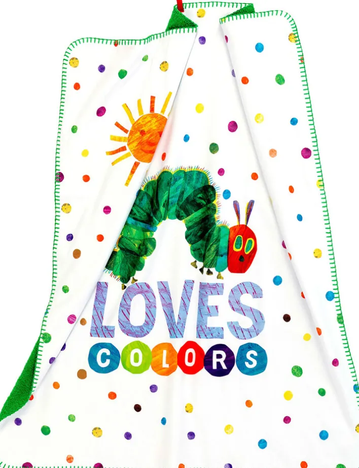 Die mehrfarbige Smithy by Dagmar Nelk Kinderdecke RAUPE NIMMERSATT ist 75 cm breit und 90 cm lang. Sie bezaubert mit einem großen Motivdruck der niedlichen Raupe Nimmersatt und unzähligen bunten Punkten auf weißem Untergrund. Die andere Seite der Decke ist einfarbig grün gehalten.