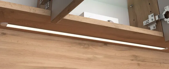 Spiegelschrank LIVORNO ist 60 x 64 cm groß und im Farbton Wotan Eiche ein stilvoller Hingucker. Er ist 20 cm tief und verfügt über eine Aufsatzleuchte sowie eine Nischenbeleuchtung.