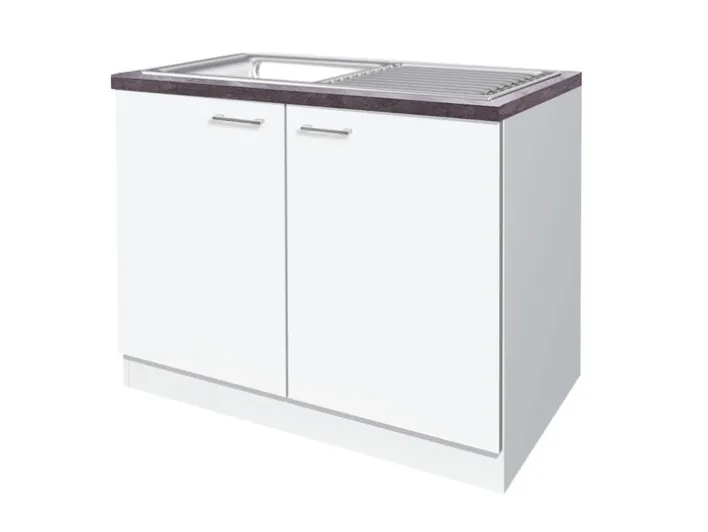 Der Spülenunterschrank PETE in Weiß besteht aus hochwertiger Holznachbildung und wird komplett mit einer Edelstahl-Einbauspüle inklusive Ab- und Überlaufgarnitur geliefert. Mit den Maßen 100 x 85 x 60 cm ist er großzügig bemessen und mit chromfarbenen Griffen ausgestattet, die perfekt zur Spüle passen. Hinter den zwei Drehtüren verbirgt sich viel Platz, ideal beispielsweise für ein Müllsystem. Die Füße des Schranks lassen sich elegant hinter einer weißen Sockelblende verstecken.