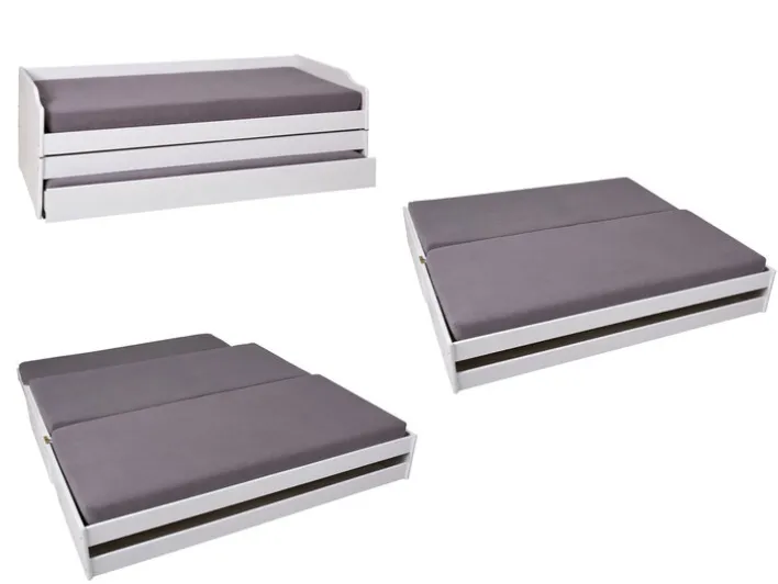 JANNES wird aus massivem, weiß lackiertem Kiefernholz hergestellt. Im Lieferumfang sind zwei Lattenroste enthalten. Diese sind bis maximal 100 kg belastbar. Bei Bedarf kann das Bett ausgeklappt werden, wodurch eine praktische und komfortable Gästeliege entsteht. Eine weitere Gästeliege kann aus dem Schubkasten unterhalb der oberen Gästeliege herausgezogen werden. Alternativ bietet dieser Schubkasten viel Stauraum, der etwa für Bettwäsche genutzt werden kann.