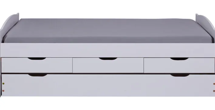 Das Stauraum-/Funktionsbett JULIUS mit integriertem Lattenrost benötigt eine Stellfläche von 98 x 63 x 195 cm. Hergestellt aus weiß lackiertem Kiefer Massivholz ist das Bett sehr robust und mit einem Gewicht von bis zu 100 kg belastbar. Das Gestell des Bettes bietet drei geräumige Schubladen und hält eine Überraschung parat. Unter den Schubkästen befindet sich eine Gästeliege, die im Handumdrehen einsatzbereit ist.