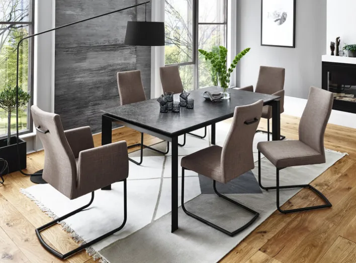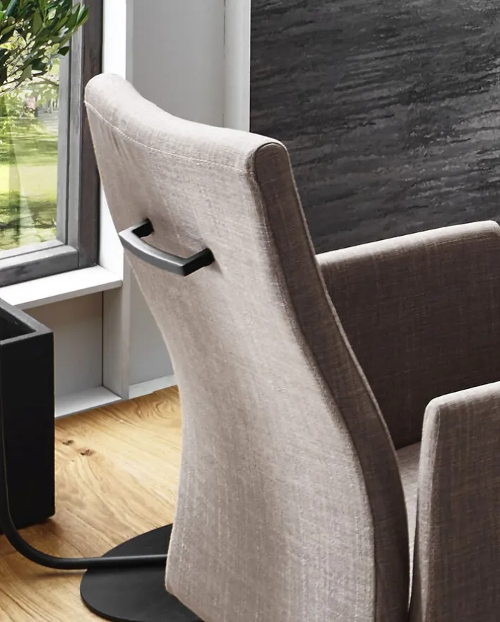 Der Stuhl präsentiert sich in einem ansprechenden Khaki-Farbton, der sich harmonisch in verschiedene Wohnstile einfügt. Der Bezug aus Textil verleiht dem Stuhl eine angenehme Haptik und sorgt für zusätzlichen Komfort. Das Gestell aus Metall in Schwarz bietet Stabilität und unterstreicht das moderne Erscheinungsbild des Schwingstuhls. Die Armlehnen und die ergonomische Form des Stuhls tragen zu einem hohen Sitzkomfort bei, ideal für lange Abende am Esstisch.