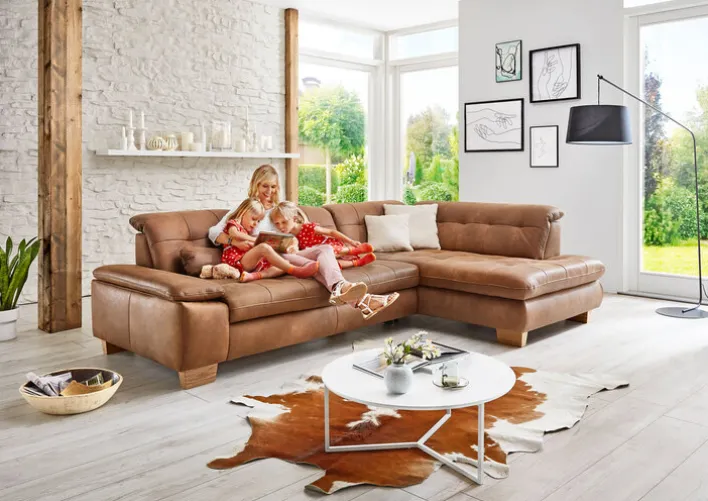 Das geräumige Ecksofa WAVER bietet bequem Platz für mehrere Personen. Es eignet sich ideal zum Gestalten einer gemütlichen Wohnland vor allem in großen Räumen. Der Lederbezug in sanftem Braun hat einen Vintage-Look, was dem Sofa nur umso mehr Gemütlichkeit und Charakter verleiht. Die Polster verfügen über einen hochwertigen Federkern und sorgen so für höchsten Sitzkomfort. Für Stabilität sorgen die rustikal gehaltenen Füße aus Massivholz