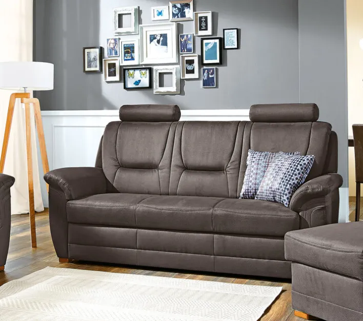 Mit dem SYSTEMPOLSTER Sofa IMATRA-H erhalten Sie einen klassischen 3-Sitzer mit mittlerer Sitzhöhe. Seine hohen Rückenlehnen sind so gestaltet, dass Sie sich ganz entspannt zurück lehnen können. Zwei gepolsterte Armlehnen an den Außenseiten des 3-sitzigen Sofas und eine mit einem Super-Bonell-Federkern ausgestattete Sitzfläche erhöhen den Sitzkomfort. Ein Holzfuß im Farbton Antik verleiht dem SYSTEMPOLSTER Sofa IMATRA-H einen sicheren Stand und sorgt für eine gute Belüftung des Unterbodens. Der Rücken des Sofas ist mit Nessel bezogen.