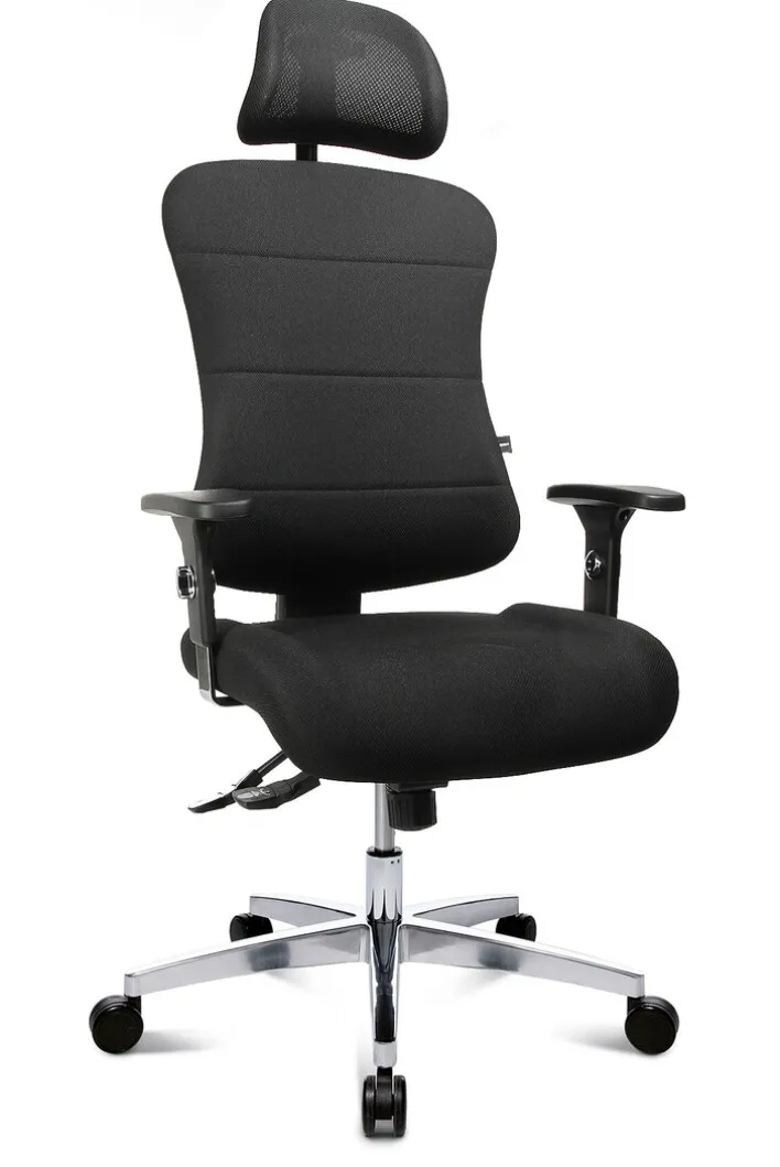 Die Sitzhöhe lässt sich bei diesem Drehstuhl per Toplift auf individuelle Anforderungen einstellen. Der gepolsterte Sitz ist über ein Gelenk mit dreidimensionaler Beweglichkeit mit der Rückenlehne verbunden und von Armlehnen eingerahmt. Lange vorhaltender Komfort wird mittels Punktsynchronmechanik sichergestellt, sie sorgt für die dreidimensionale Beweglichkeit der Sitzfläche im Einklang mit der Rückenlehne, welche zudem mit einer Lendenwirbelstütze versehen ist. Über alle gepolsterte Elemente spannt sich ein Bezug aus strapazierfähigem Stoff in schwarzer Farbgebung.