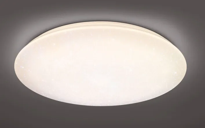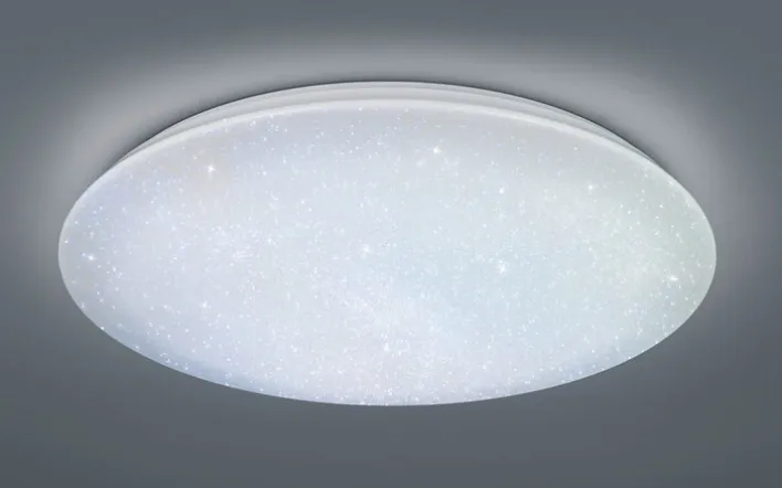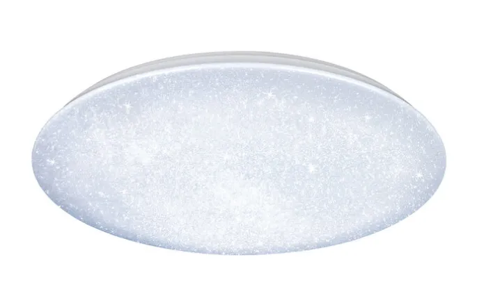 Die fest eingebaute LED ist auf 25.000 Stunden Brenndauer ausgelegt. Sie erreicht 3.000 bis 5.500 K (Kelvin), das entspricht warmweißem beziehungsweise tageslichtweißem Licht. Mit der Fernbedienung stellen Sie die Lampe nach Ihren Wünschen ein. Ihre Helligkeit beträgt 6.400 lm (Lumen). Die Deckenlampe NAGANO ist schlicht gearbeitet und passt in jeden Raum (außer Feuchträume). Besonders schön wirkt sie im Schlafzimmer oder Kinderzimmer, denn ihr Sterneffekt passt hierher am besten.